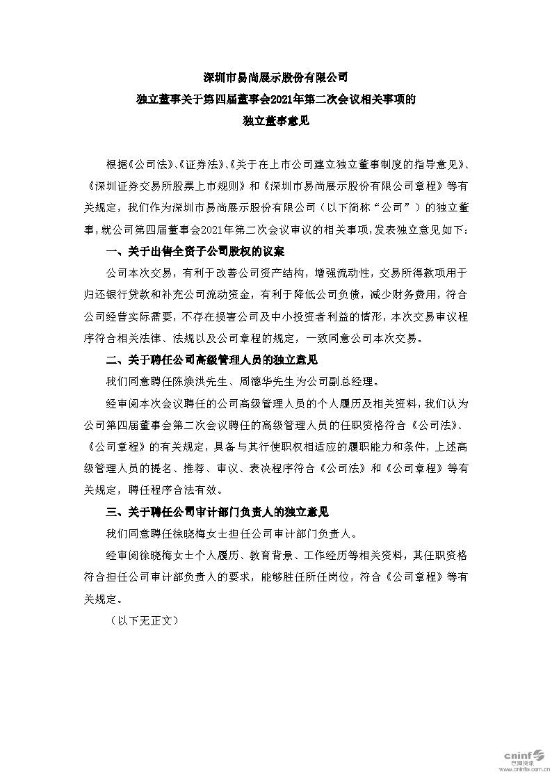 深圳市易尚展示股份有限公司 独立董事关于第四届董事会2021年第二次会议相关事项的 独立董事意见